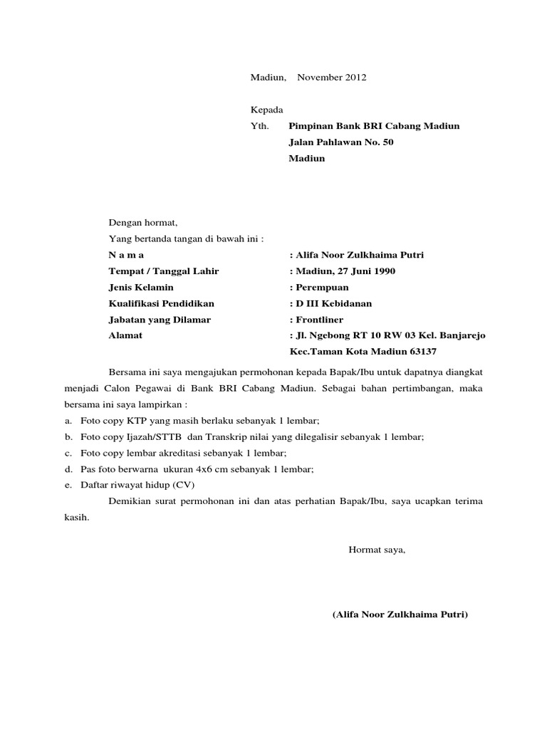 Contoh surat lamaran kerja di bank bri sebagai frontliner