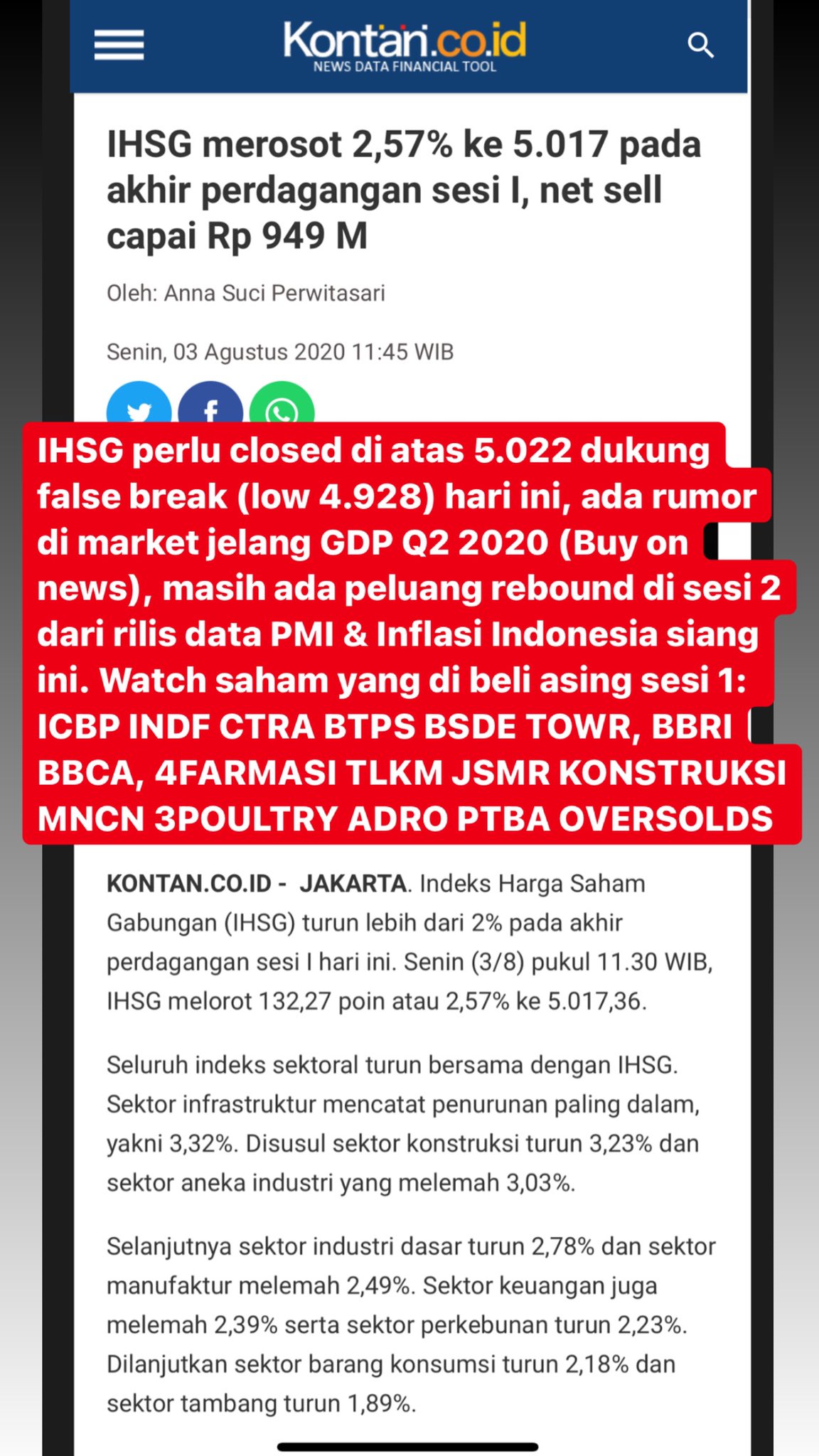 PGAS kembali gagal bertahan diatas support line (garis merah) di 1435 setelah sebelumnya juga gagal bertahan diatas support minor di 1465. Jika saham ini tidak mampu kembali keatas level supportnya, maka segala kenaikan saham ini hanyalah technical rebound dalam tren turun. Penurunan PGAS selanjutnya berada di level 1310 dengan minor target 1390. Sebanyak 202 saham hijau, 315 saham merah dan 152 saham bergerak stagnan. IHSG melaju dalam rentang 6.547,25-6.579,12 selama sesi perdagangan hari ini . Dari Sri Kehati hingga ESG Quality 45 IDX, Kenali 4 Indeks Berbasis ESG Di Indonesia