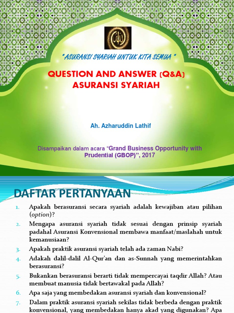 Jelaskan perbedaan asuransi syariah dan asuransi konvensional. Perbedaan tujuan antara asuransi konvensional dan asuransi syariah akan berpengaruh kepada pelaksanaan usaha asuransi tersebut. Transaksi yang sama antara kedua asuransi tersebut bisa berbeda cara pengakuannya. Hal ini disebabkan karena adan ya perbedaan tujuan yang harus dicapai oleh asuransi konvensional dan asuransi syariah . Perbedaan asuransi syariah dan asuransi konvensional yang kedua terletak pada akadnya. Akad yang menjadi landasan asuransi syariah adalah akad takaful yang artinya tolong menolong. Jadi jika terjadi musibah terhadap nasabah, maka nasabah lain akan membantunya menggunakan dan a tabarru atau dan a sosial. Perbedaan Asuransi Syariah dan Konvensional Secara garis besar, asuransi konvensional menggunakan operasional keuangan haram dan halal, sedan gkan asuransi syariah menggunakan operasional berdasarkan syariah islam. Dari perbedaan mendasar itu juga masih memiliki perbedaan lainnya, yakni: Asuransi Konvensional Saling menanggung. Kapita Selekta Hukum Bisnis Perbedaan Asuransi Konvensional dan Asuransi Syariah Disusun Oleh : Fikra Abdul Razaq F (1133.006.021) Fakultas Hukum Universitas Krisnadwipayana 2012 Kata Pengantar Puji syukur atas kehadirat ALLAH swt.yang telah memberikan rahmat dan hidayahnya kepada Penulis, sehingga Penulis dapat menyelesaikan tugas ini guna memenuhi persyaratan dalam mata kuliah Kapita Selekta ...