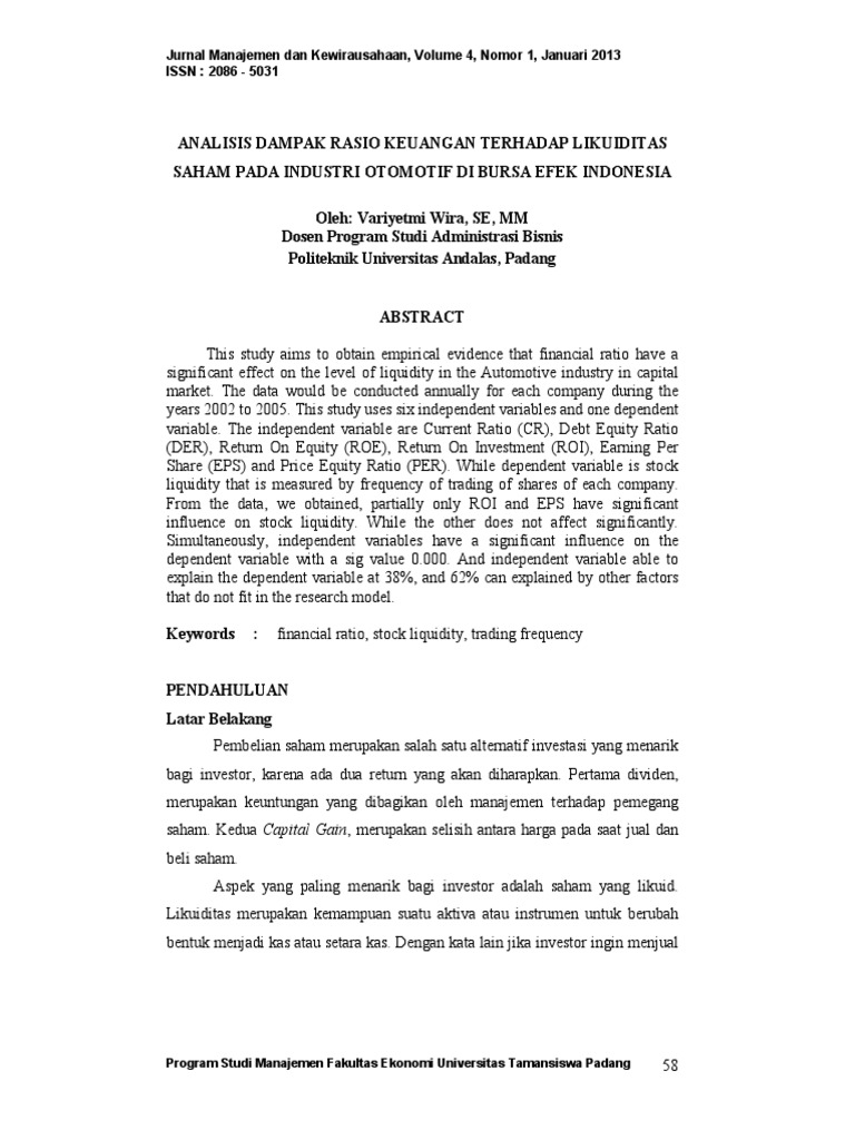 pengaruh rasio keuangan terhadap harga saham pada perusahaan manufaktur yang terdaftar di bursa efek indonesia tahun 2010-2014. download. related papers. analisis rasio keuangan. Rasio keuangan yang dapat dipakai untuk memprediksi return saham antara lain rasio likuiditas dan rasio solvabilitas. Tujuan dari penelitian ini adalah untuk mengetahui pengaruh Current Ratio dan Debt to Equity Ratio terhadap return saham pada perusahaan dagang ecer yang terdaftar di Busa Efek Indonesia (BEI).
