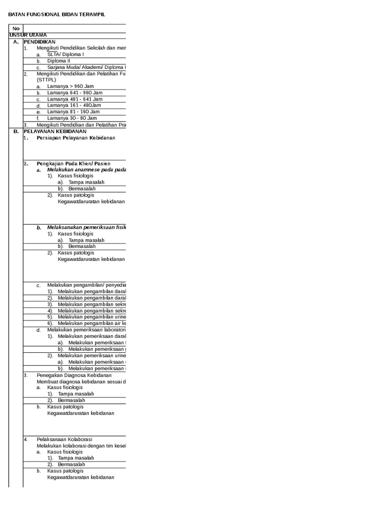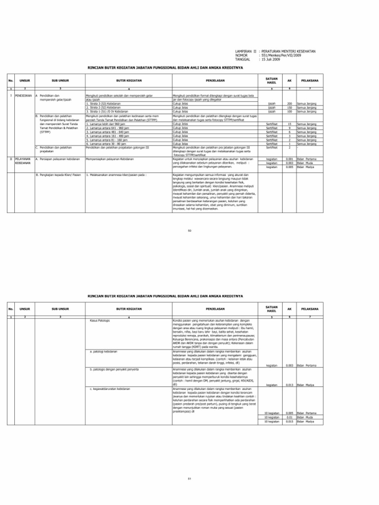 RINCIAN BUTIR KEGIATAN JABATAN FUNGSIONAL BIDAN TERAMPIL DAN ANGKA KREDITNYA. SATUAN HASIL No. UNSUR SUB UNSUR BUTIR KEGIATAN AK PELAKSANA. 1 2 3 4 5 6 7 Rating: 5 · 1 voteMissing: download | Must include: download