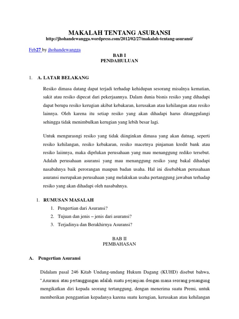 by DKOJ KEUANGAN · Cited by 7 — 2. Asuransi adalah perjanjian antara dua pihak, yaitu perusahaan asuransi dan pemegang polis, yang menjadi dasar bagi penerimaan premi oleh perusahaan asuransi.53 pagesMissing: mengadakan | Must include: mengadakan