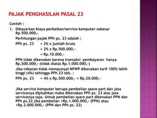 Cara Menghitung PPN dan PPh Pembelian Barang Berdasarkan Undang-Undang Nomor 36 Tahun 2008 tentang Pajak Penghasilan (PPh), PPh Pasal 22 merupakan iuran atau pungutan pajak yang dilakukan suatu pihak kepada wajib pajak dan berkaitan dengan kegiatan perdagangan suatu barang. Ketentuan PPh Pasal 22 ini terbilang rumit, mengingat baik dari objek, tarif, hingga pemungutannya sangat bervariasi.