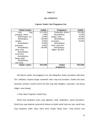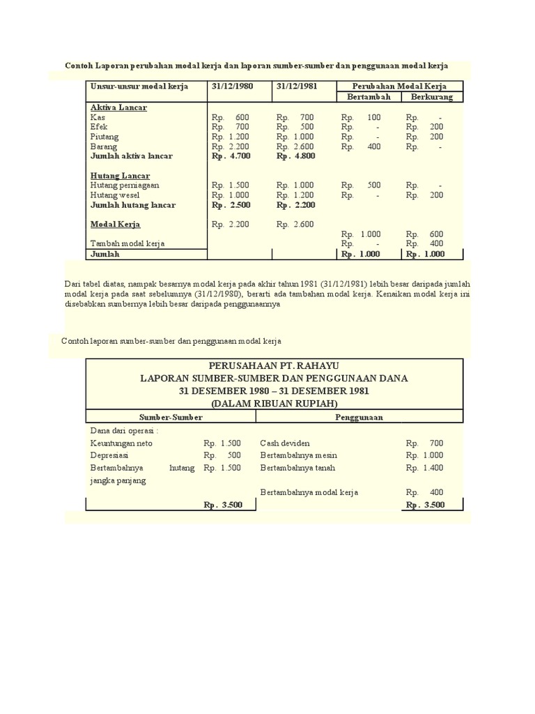 Mencicipi Kesuksesan Amanda Brownies Kukus - Google Books Result Indari Mastuti, Agustin Rozalena · 2010 · Business & Economics... termasuksumber, ketersediaan pasokan, volume, mobilisasi bahan baku, ... rencana laporan pendapatan (laba/rugi) dan sumber serta penggunaan dana. Cara Menghitung Modal Kerja - wikiHow 6 steps1.Hitunglah besarnya aktiva lancar. Aktiva lancar adalah aktiva perusahaan yang bisa dikonversikan menjadi uang tunai dalam waktu satu tahun. Aktiva ini ...2.Hitunglah besarnya utang lancar. Utang lancar adalah kewajiban yang akan jatuh tempo dalam waktu satu tahun. Akun yang termasuk dalam utang lancar antara ...3.Hitunglah besarnya modal kerja. Perhitungan ini dilakukan dengan pengurangan biasa. Kurangilah aktiva lancar dengan utang lancar. Contohnya, sebuah ... Laporan Sumber dan Penggunaan Dana - ANUGERAH DINO Penggunaan dana juga terkait dengan sumber dana. Dengan adanya sumber dana, penggunaan dana dapat dilakukan. Oleh karena itu, sebagai pelengkap laporan keuangan sebaiknya disusun pula laporan sumber dan penggunaan dana. Makalah Sumber dan Penggunaan Modal Dari laporan sumber dan penggunaan modal kerja ini akan membantu manajer keuangan dalam melaksanakan kegiatan perusahaannya dalam hal menentukan jumlah dana yang harus tersedia dan untuk dapat melihat asal; sumber dana itu diperoleh.