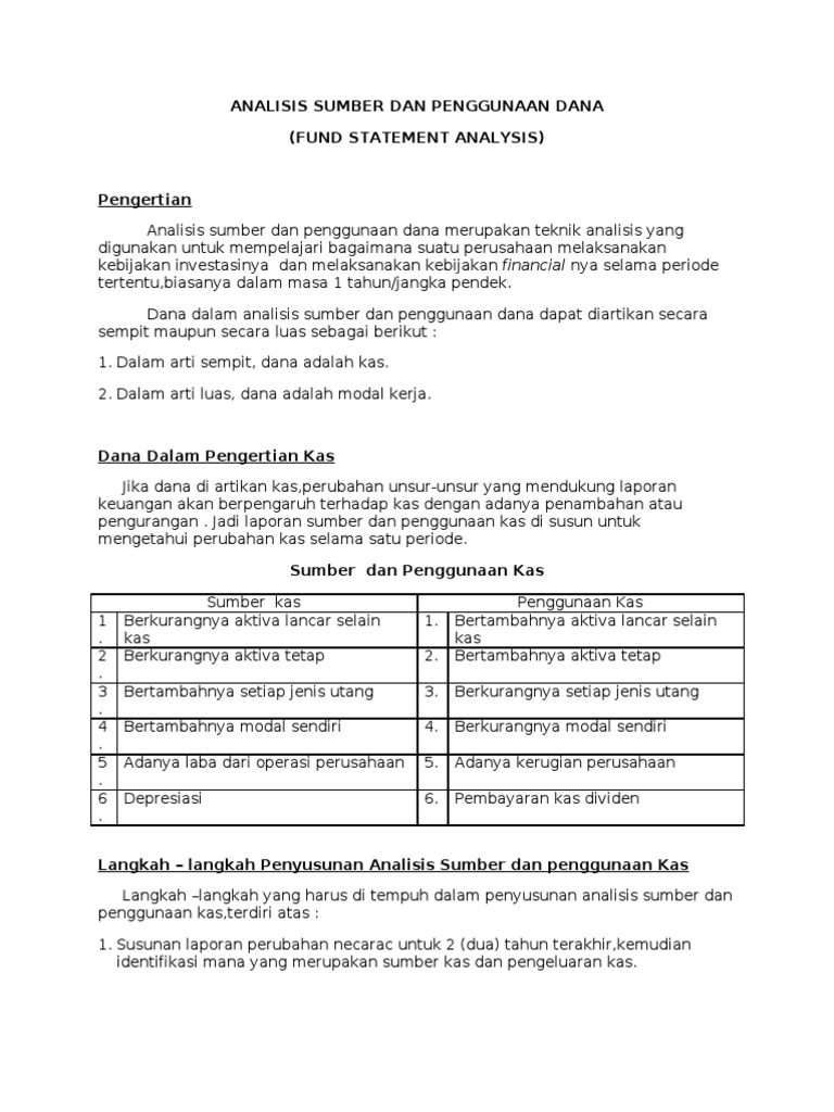 Analisis sumber dan penggunaan dana (1) Analisis sumber dana dan penggunaan da terbagi menjadi dua yaitu, dana dalam pengertian kas yang artinya setiap perubahan elemen yang ada pada laporan keuangan akan menambah atau mengurangi kas. Adapun dana dalam pengertian modal yaitu merupakan aktiva yang digunakan... Laporan Sumber Penggunaan Dana Arti Pentingnya Laporan Sumber dan Penggunaan Dana. Analisis sumber dan penggunaan dana, atau sering disebut dengan analisa aliran dana, merupakan alat analisa financial yang digunakan untuk mengetahui dari mana dana didapatkan dan untuk apa dana itu dibelanjakan.