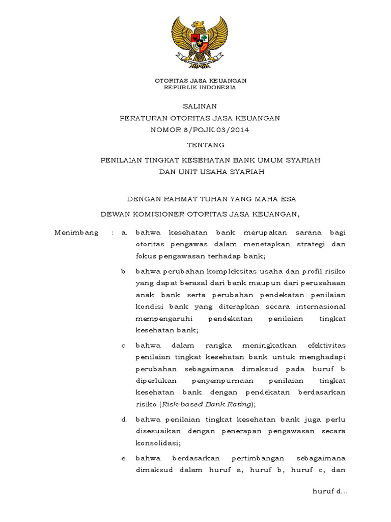 PDF HASIL PENELITIAN Penilaian Kesehatan Bank Umum Syariah... Metode rgec : penilaian tingkat kesehatan bank pada perusahaan perbankan syariah. Kesehatan Bank Umum Syariah dan Unit Usaha Syariah. Peraturan Bank Indonesia (PBI) No.13/1/PBI/2011 Tentang Penilaian Tingkat Bank Umum. Pentingkah Penilaian Kesehatan Bank Syariah? - Kompasiana.com Penilaian kesehatan bank ini sangat penting dikarenkan masyarakat sudah memberikan kepercayaannya kepada bank untuk mengelola Berdasarkan Peraturan Otoritas Jasa keuangan No. 8/POJK.03/2014 tentang Penilaian Tingkat kesehatan Bank Umum Syariah dan Unit Usaha Syariah. PDF Judul Skripsi : Analisis Penilaian Tingkat Kesehatan Bank Pembiayaan Bank Indonesia melakukan penyesuaian terhadap penilaian tingkat kesehatan bank syariah apabila diketahui terdapat data dan informasi yang memengaruhi kondisi bank tersebut secara signifikan pada posisi setelah posisi penilaian (subsequent events). Profil risiko masuk penilaian risiko bank syariah Sementara untuk penilaian GCG, manajemen bank syariah akan dinilai berdasarkan pelaksanaan lima prinsip GCG. Kelima prinsip tersebut adalah transparansi, akuntabilitas, pertanggungjawaban, profesional, dan kewajaran. Dus, menurut Edi, dengan RBBR, tingkat kesehatan bank syariah tidak...