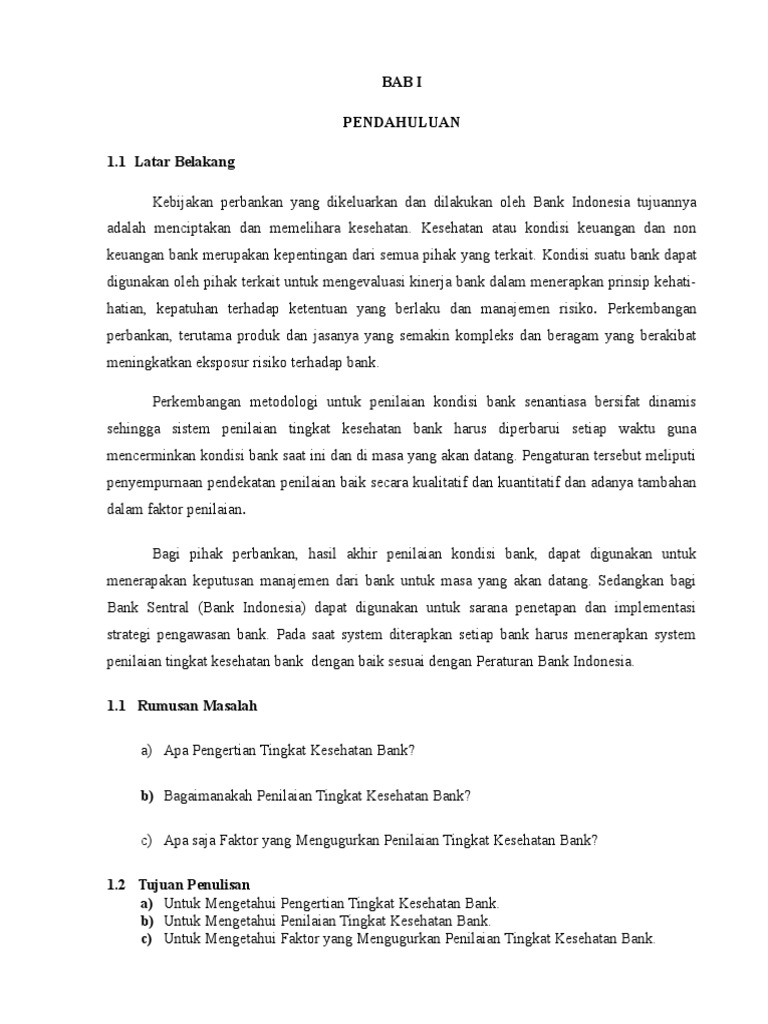 penilaian tingkat kesehatan bank B. Aturan penilaian kesehatan Bank. Berdasarkan Undang-undang Nomor 10 Tahun 1998 tentang Perubahan atas Undang-undang No.7 b. Dalam memberikan kredit atau pembiayaan berdasarkan prinsip syariah dan melakukan kegiatan usaha lainnya, bank wajib menempuh cara-cara yang tidak...