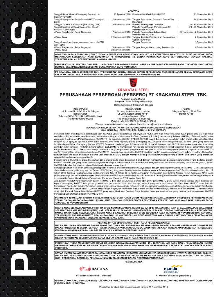 Saya Tidak Peras Krakatau Steel, Kata Siapa... - Kompasiana.com PT Krakatau Steel Tbk (kode saham: KRAS) adalah 1 dari lebih 400 perusahaan yang telah mencatatkan sahamnya di Bursa Efek Indonesia (BEI). Dicatatkan pada 10 November 2010 pada harga Rp850 per lembar saham. Seperti diatur dalam Undang-Undang Nomor 8 Tahun 1995...