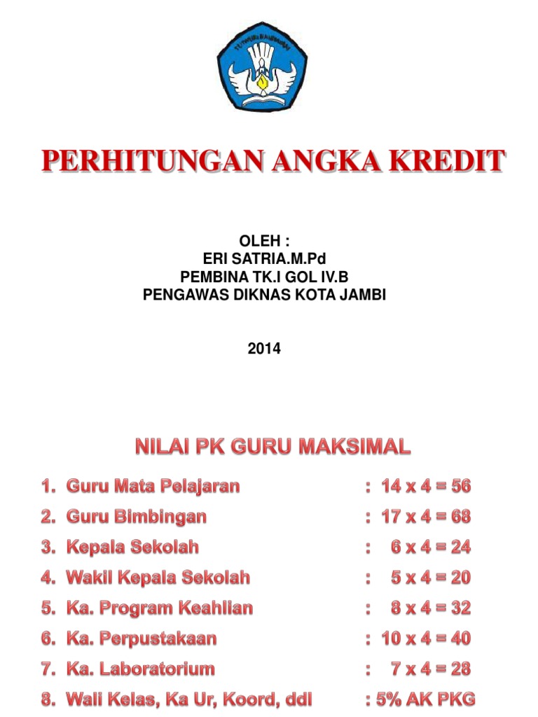 Ingin Naik Pangkat? Ini Komposisi Angka Kredit Guru yang ... Komposisi Angka Kredit Guru. Angka Kredit Guru yang digunakan untuk kenaikan pangkat terdiri dari unsur utama (90%) dan unsur penunjang (10%). Unsur utama dalam kegiatan tugas jabatan yaitu: 1. Pendidikan. Angka Kredit pada unsur Pendidikan didapatkan dari ijazah pendidikan tinggi dan mengikuti suatu pelatihan atau diklat prajabatan.