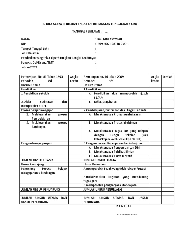 Tabel Angka Kredit Guru Tahun 2019 - Berkas Sekolah Tabel Angka Kredit Guru Tahun 2019. Berkas Sekolah - Dalam artikel kali ini kita akan membagikan Tabel Angka Kredit Guru Tahun 2019 dalam format Excel yang bisa di Unduh Gratis dan Lengkap. Lengkap Disini yakni dimulai dari Golongan terendah seperti Golongan II-D, II-C, II-B, II-A, III-D, III-C, III-B, III-A, IV-A dan IV-B. Dilengkapi dengan ... Contoh Menghitung Angka Kredit (PAK ... - rinosafrizal.com Angka Kredit untuk jabatan fungsional guru dapat diperoleh dari berbagai unsur yaitu pendidikan, pembelajaran / bimbingan dan/ atau tugas tambahan, kegiatan PKB, dan unsur penunjang. Syarat Pengusulan Penilaian Angka Kredit PAK Guru PNS IIIa ... Syarat Pengusulan Penilaian Angka Kredit PAK Guru PNS IIIa ke IIIb. Kebutuhan Angka Kredit untuk kenaikan pangkat dan jabatan dari Penata Muda, IIIa ke Penata Muda Tingkat 1, IIIb sebesar 50 (lima puluh). Kebutuhan Angka Kredit tersebut dapat diperoleh dari unsur utama dan unsur penunjang yang dimiliki guru selama kurun waktu penilaian. pendidikan: penghitungan angka kredit - Blogger Angka kredit satu tahun= (AKK-AKPKB-AKP) x (JM/JWM) x NPK ... Menjadi wali kelas. 8. Menyusun kurikulum pada satuan pendidikannya. 9. Menjadi pengawas penialain dan evaluasi terhadap proses dan hasil belajar. 10. Membimbing guru pemula dalam program induksi. 11.