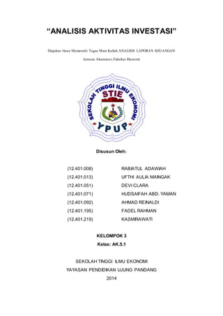 BAB 4 - Analisis Aktivitas Investasi | PDF - Scribd BAB 4 - Analisis Aktivitas Investasi. Diunggah oleh. Kingkin Kts. 100% (4) 100% menganggap dokumen ini bermanfaat (4 suara) 417 tayangan 59 halaman. Informasi Dokumen. klik untuk memperluas informasi dokumen. Deskripsi: PPT analisis Laporan Keuangan bab Analisis Aktivitas Investasi.