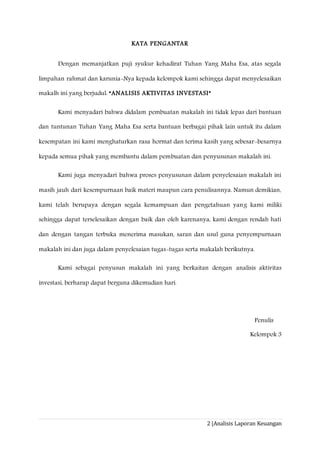 Analisis Aktivitas Pendanaan - Ahmad Husein Hasibuan KATA PENGANTAR Assalamu'alaikum wr. wb. Puji dan syukur Kita sanjung tinggikan kehadirat Allah SWT sebagai pencipta pemelihara alam semesta berkat rahmat dan hidayah-Nya kami dapat menyusun makalah yang berjudul "ANALISIS AKTIVITAS PENDANAAN" ini tepat pada waktunya. Shalawat bertangkaikan salam kita sanjung tinggikan ke Ruh Baginda Rasulullah SAW yang selalu kita harapkan syafaatnya ...