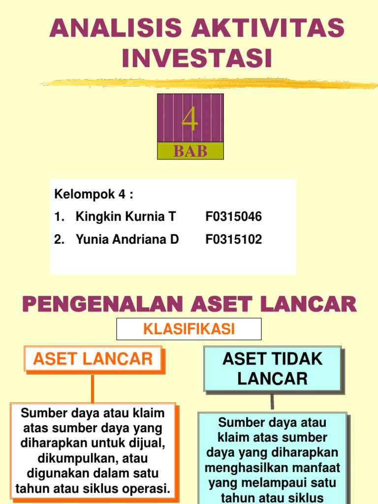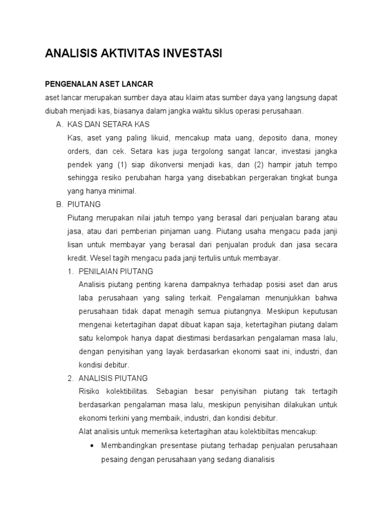 ALK Kelompok 2.pptx - BAB 3 ANALISIS AKTIVITAS PENDANAAN ... View ALK Kelompok 2.pptx from ACCOUNTING 124 at Trisakti University. BAB 3 ANALISIS AKTIVITAS PENDANAAN & BAB 4 ANALISIS AKTIVITAS INVESTASI 123151018 Asthon Siagian 123151062 Rayi Agung Alk Bab 5 - Analisis Aktivitas Investasi-investasi ... MUHAMMAD ILHAM KHOIRUL ASHIM 142160165 EA - B ANALISIS AKTIVITAS INVESTASI: INVESTASI ANTAR PERUSAHAAN ANALISIS AKTIVITAS ANTARPERUSAHAAN DAN INTERNASIONAL 1. Efek Infestasi a. Akuntansi untuk efek investasi b. Pengungkapan efek investasi c. Analisis efek investasi 2. Akuntansi Ekuitas a. ANALISIS AKTIVITAS INVESTASI Chapter 4 ANALISIS AKTIVITAS INVESTASI Chapter 4. Aktiva lancar adalah kas dan asset lainnya yang langsung dapat diubah menjadi kas melalui siklus operasi perusahaan. 1. Kas dan Setara Kas. Kas mencakup uang kas dan deposito. Adapun setara kas berupa investasi jangka pendek yang siap dikonversi menjadi kas dan hampir jatuh tempo. Analisis Bisnis: Pengertian, Tujuan, Komponen, dan Jenis ... Menurut buku dari K. R. Subramanyam serta John J. Wild tahun 2010, analisis bisnis dibagi menjadi dua jenis, yaitu: 1. Analisis Kredit. Analisis kredit merupakan proses penilaian dan evaluasi kelayakan perusahaan untuk mendapatkan pinjaman atau kredit.