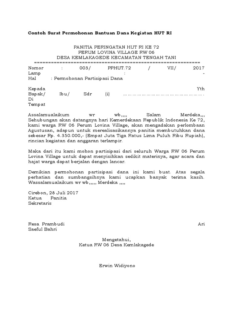 10+ Contoh Surat Permohonan Bantuan Dana ... - Salamadian Ini adalah beberapa contoh surat permohonan, baik itu permohonan dana bantuan ke perusahaan, permohonan izin, kerjasama, rekomendasi, maaf, permohonan cuti dan lain sebagainya. 1. Contoh Surat Permohonan Bantuan Dana Kegiatan. Panitia Acara HUT Republik Indonesia Kompleks Tangerang Indah VI Tangerang Selatan (kop surat lembaga atau organisasi ...