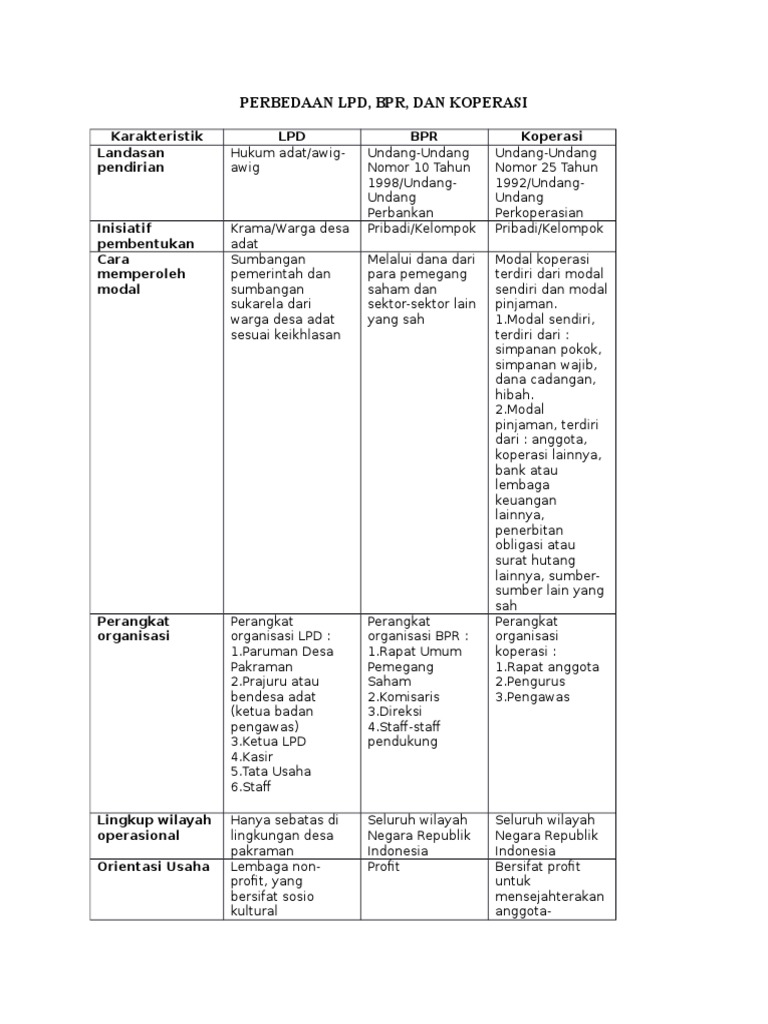 makalah Perbedaan Bank Umum dan Bank Perkreditan Rakyat ... Bank Umum menghimpun dana dari masyarakat dalam bentuk simpana Giro, simpanan tabungan dan simpanan Deposito; sedangkan Bank Perkreditan Rakyat menghimpun dana hanya dalam bentuk simpanan Tabungan dan simpanan Deposito. 3. Bank Perkreditan Rakyat di larang untuk mengikuti kliring, sedangkan Bank umum dapat memberikan jasa kliring. Perbedaan Bank Umum dan BPR, Ketahui Definisi dan Kegiatan ... Sedangkan perbedaan bank umum dan BPR dari sisi kegiatan usaha Bank Perkreditan Rakyat jauh lebih sempit jika dibandingkan dengan kegiatan bank umum. Perbedaan bank umum dan BPR ini dikarenakan BPR dilarang menerima simpanan giro, kegiatan valas, dan perasuransian. Berikut kegiatan usaha yang dapat dilaksanakan oleh BPR: Kegiatan Bank Umum Dan Bpr - Alas Banyu Kegiatan BPR pada dasarnya sama dengan kegiatan bank umum, hanya yang menjadi perbedaan adalah jasa bank yang dilakukan BPR jauh lebih sempit. BPR dibatasi oleh berbagai persyaratan, sehingga tidak dapat berbuat seleluasa bank umum. Dalam praktiknya kegiatan BPR meliputi :
