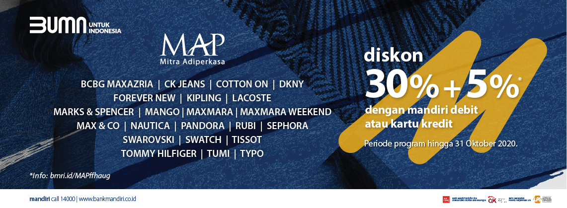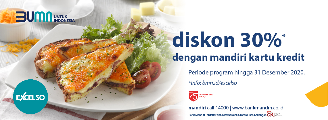 Hot Offer || Mandiri Kartu Kredit Kartu Pemerintah Hot Offer Livin'poin Fitur Mandiri Powerbill Mandiri Powercash Mandiri Powerbuy Power Installment Insurance Kenaikan Limit What's New Bandingkan Kartu Upgrade dan Naik Limit Permanen Syarat & Ketentuan Unsubcribe Promo Formulir CS Hot Offer - Mandiri Kartu Kredit 20 Jan 2022 s.d 30 Jun 2022 Hingga 30 Jun 2022 Cafe & Resto, Kartu VISA, Tanggal Muda Nasional Special Promo pesanmakan , promorestoplg , palembang , tanggalmuda Diskon Kumpulan Lengkap Promo Kartu Kredit Bank Mandiri, BCA, BRI ... Cermati.com telah mengumpulkan promo-promo menarik bagi pengguna atau pemegang kartu kredit maupun kartu debit Bank Mandiri, BCA, BRI, dan BNI. Ragam promo diskon, cashback tersebut berlaku hingga akhir tahun ini, bahkan ada yang sampai awal tahun depan.Cekidot!. Baca Juga: Catat Nih Jadwal Pesta Belanja Online dan Offline 2019, Sayang Kalau Dilewatkan